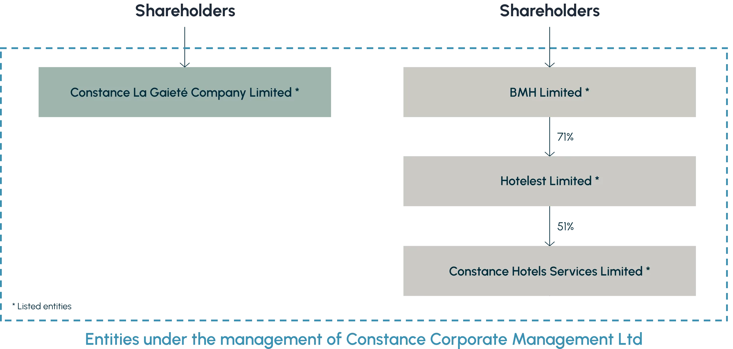 Le groupe compte deux autres entités cotées sur le second marché : Constance Hotels Services Ltd, société mère des hôtels Constance et C Resorts, et sa holding intermédiaire, Hotelest Limited.